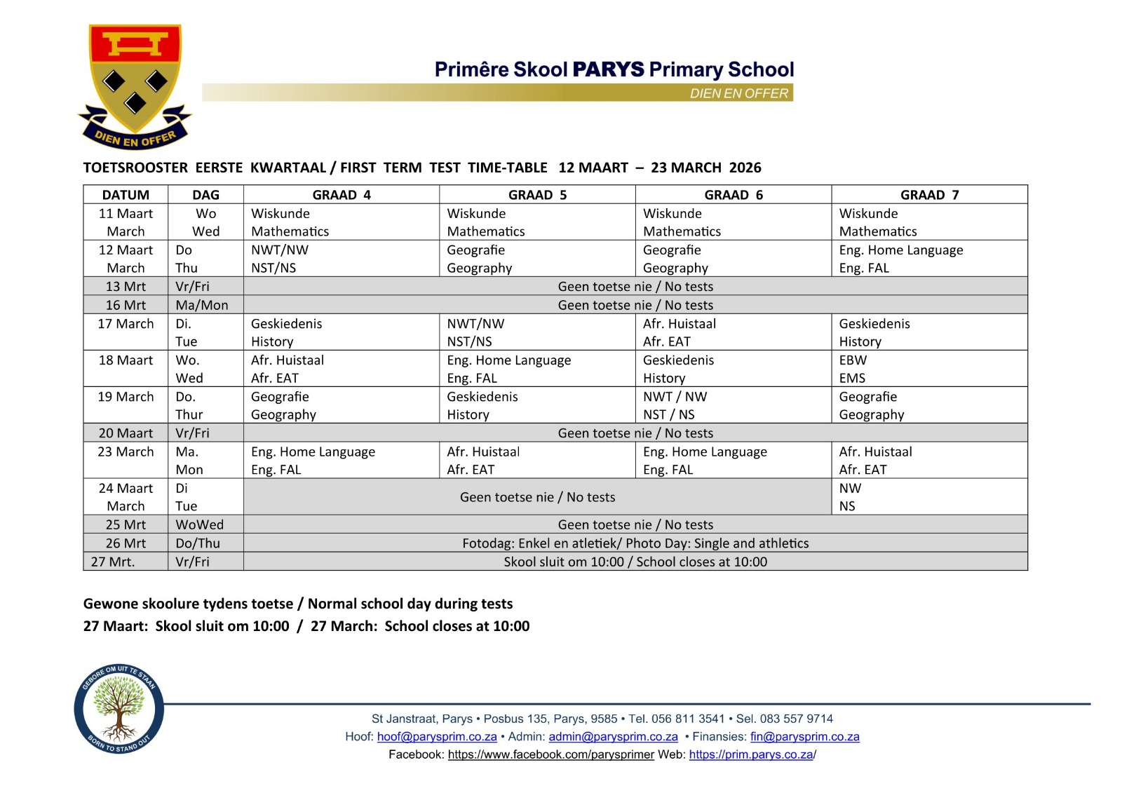 Toetsrooter Kwartaal 1 | First Term Time-Table 11 Maart – 24 Maart 2026 | 11 March – 24 March 2026 DOWNLOAD